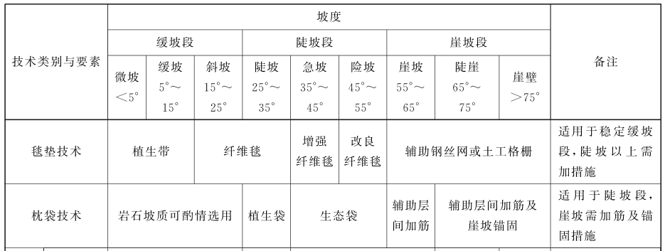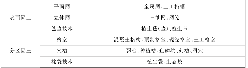 2 土工合成材料類技術(shù)措施在《裸露坡面植被恢復(fù)技術(shù)規(guī)范》(GB/T 38360-2019)中,列出了應(yīng)用土工合成材料的主要技術(shù)措施及適用范圍。